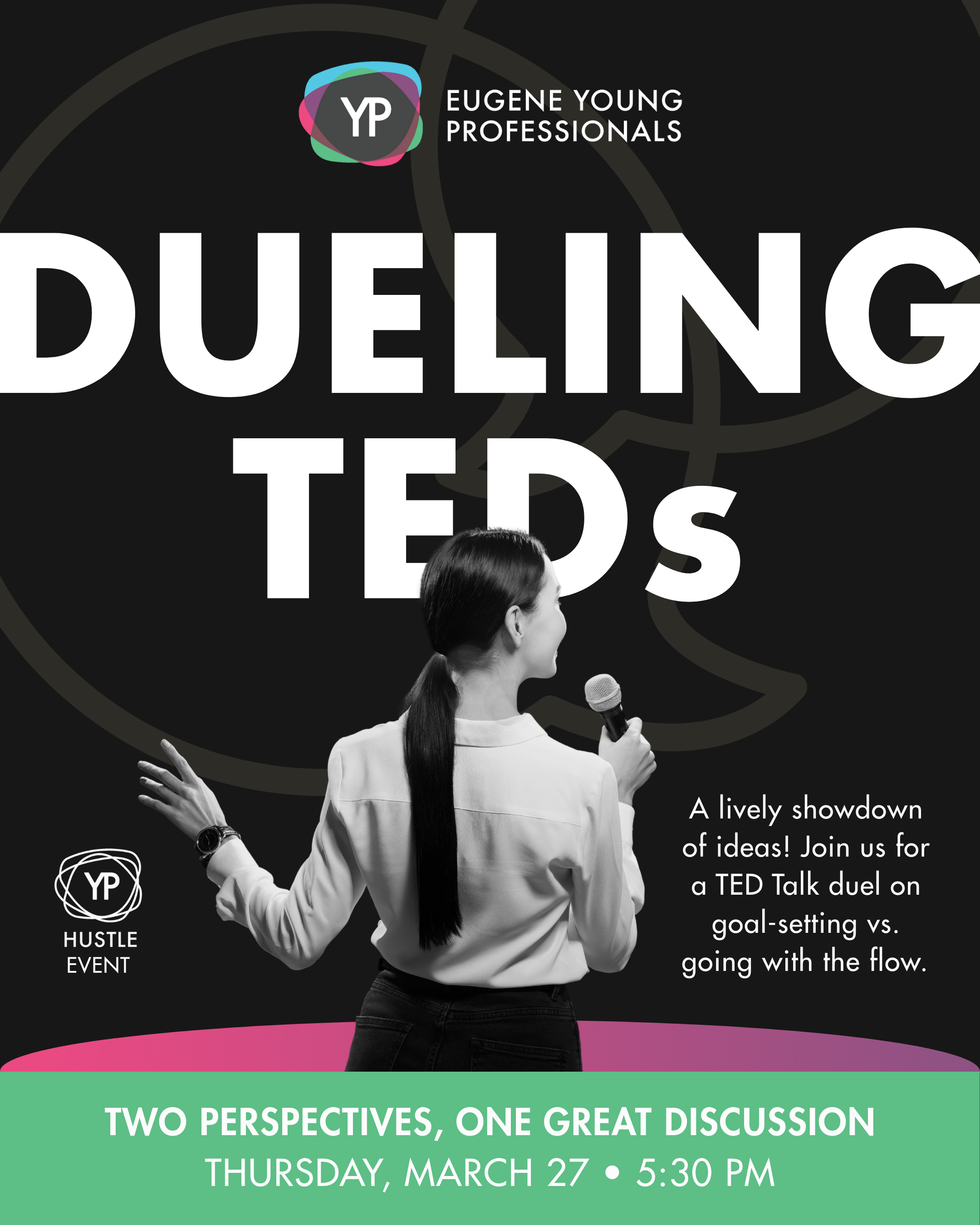 Join us at the Eugene Area Chamber of Commerce for a lively showdown of ideas! A TED TALK DUEL on goal setting VS going with the flow. Enjoy watching two Ted Talks and two different perspectives with one great discussion.